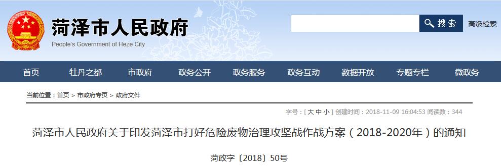 菏澤市人民政府關(guān)于印發(fā)菏澤市打好危險(xiǎn)廢物治理攻堅(jiān)戰(zhàn)作戰(zhàn)方案(2018-2020年)的通知